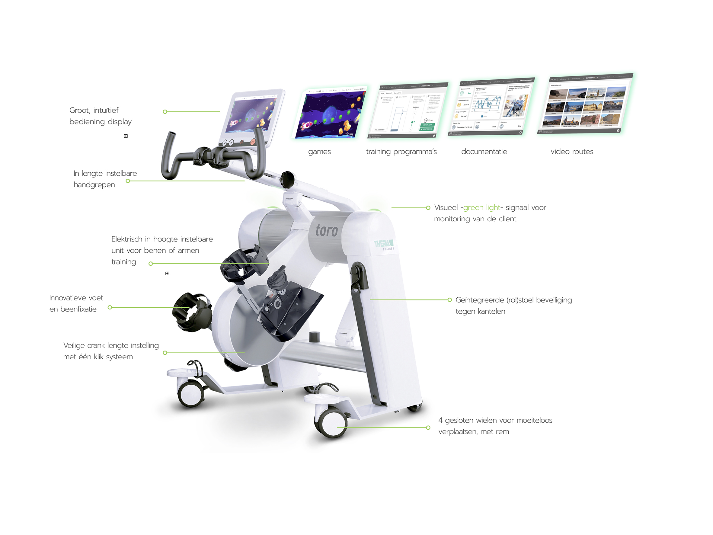 Een belangrijke innovatie is de Tool-Free aanpak. Voor het aanpassen van de TORO aan de individuele behoeften van de cliënt – zoals beenlengte, soort rolstoel, hoogte en diepte van de trainingsunit, kantel beveiliging en fixatie van voeten of benen – zijn géén gereedschappen nodig. Alles kan eenvoudig worden ingesteld met slechts één klik.